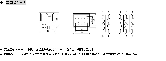 坡膜合金鐵芯,體積小,抗電強度高(12KV),傳輸脈沖寬 |